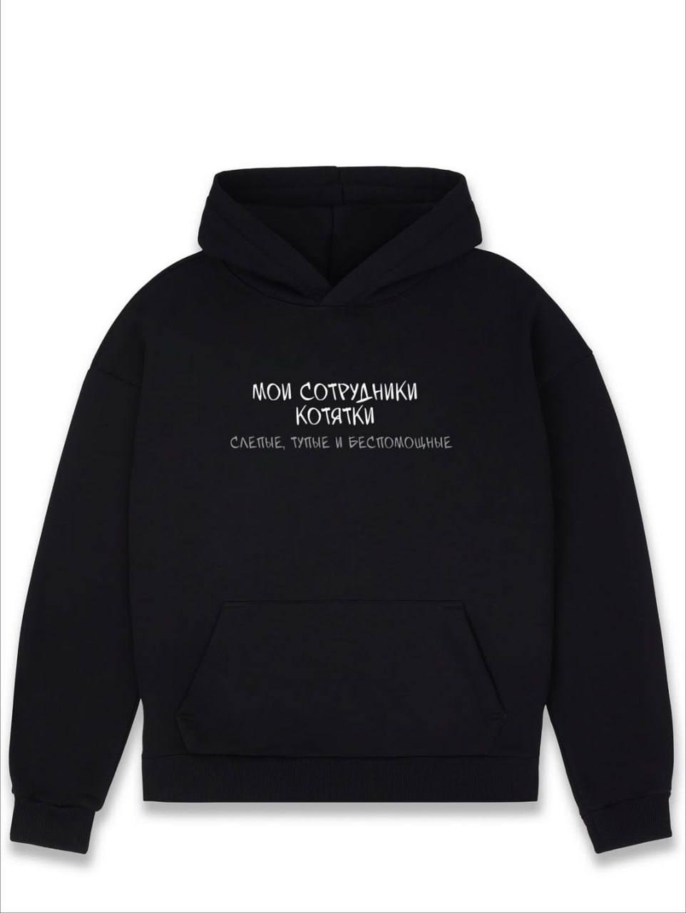 «Мои сотрудники котята: слепые, тупые и беспомощные» — самый имбовый мерч для офисных работников выпустила компания Yes Yes Brand. Все худи выдержаны в черном цвете, а надписи говорят сами за себя.